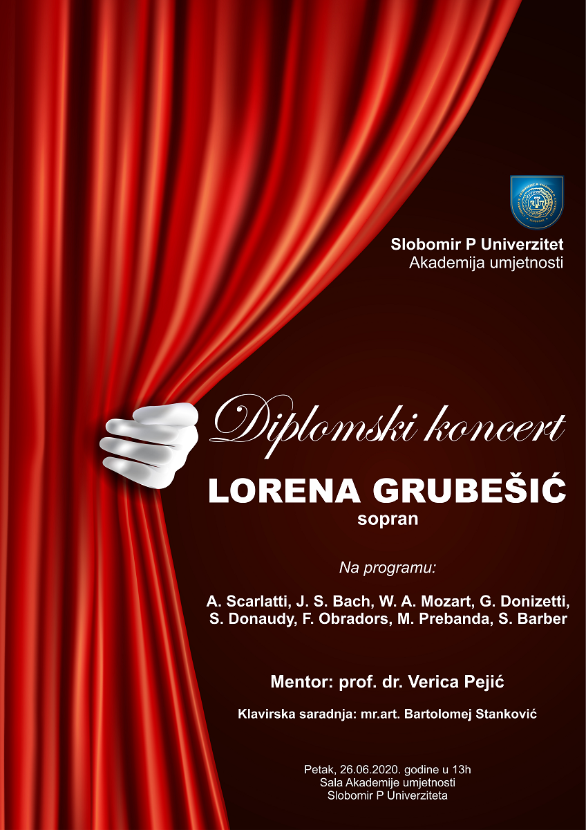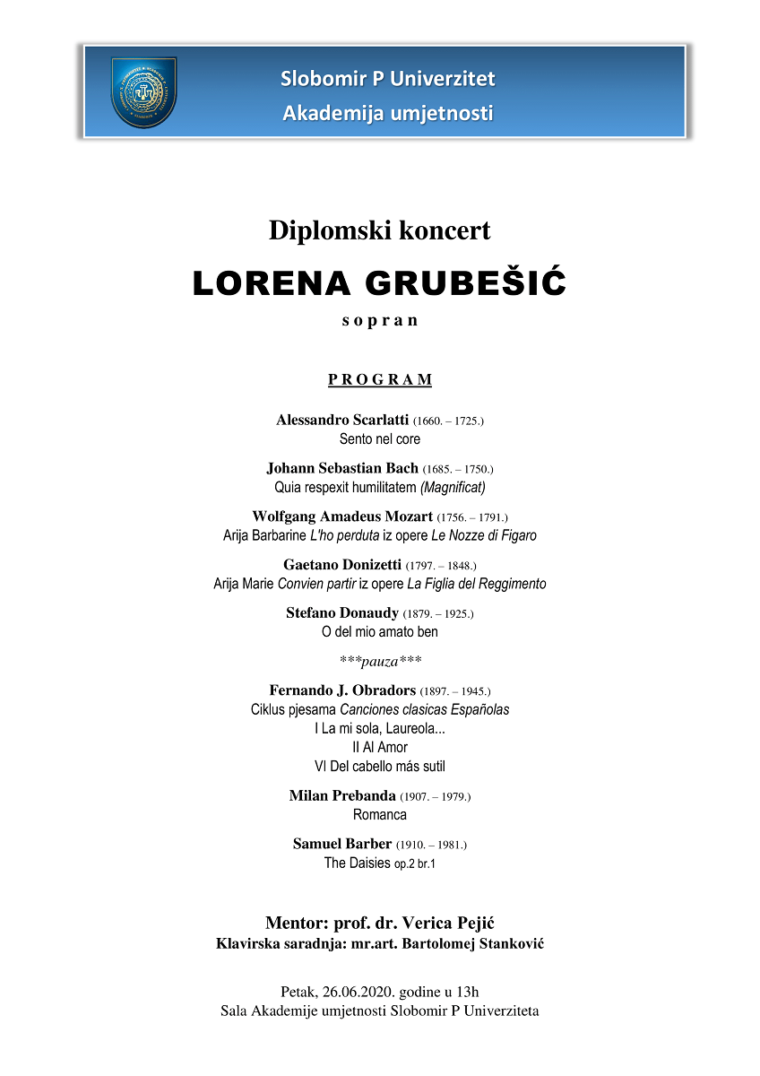 Obavještavamo vas da će se 26.06.2020.godine, u 13:00 sati, na Slobomir P Univerzitetu, kampus Slobomir, održati odbrana diplomskog rada pod nazivom: solostički koncert na kome se izvode djela – “SOLO PJEVANJE”, studenta osnovnih studija Akademije umjetnosti, Odsjek za muziku, smjer solo pjevanje Lorene Grubešić, pred ispitnom Komisijom u sljedećem sastavu:, prof.mr Aleksandra Radosavljević, predsjednik prof.dr Verica Pejić, mentor i prof.mr Dario Zombra, član. Odbrana diplomskog rada je javna, te joj svi zainteresovani mogu prisustvovati.